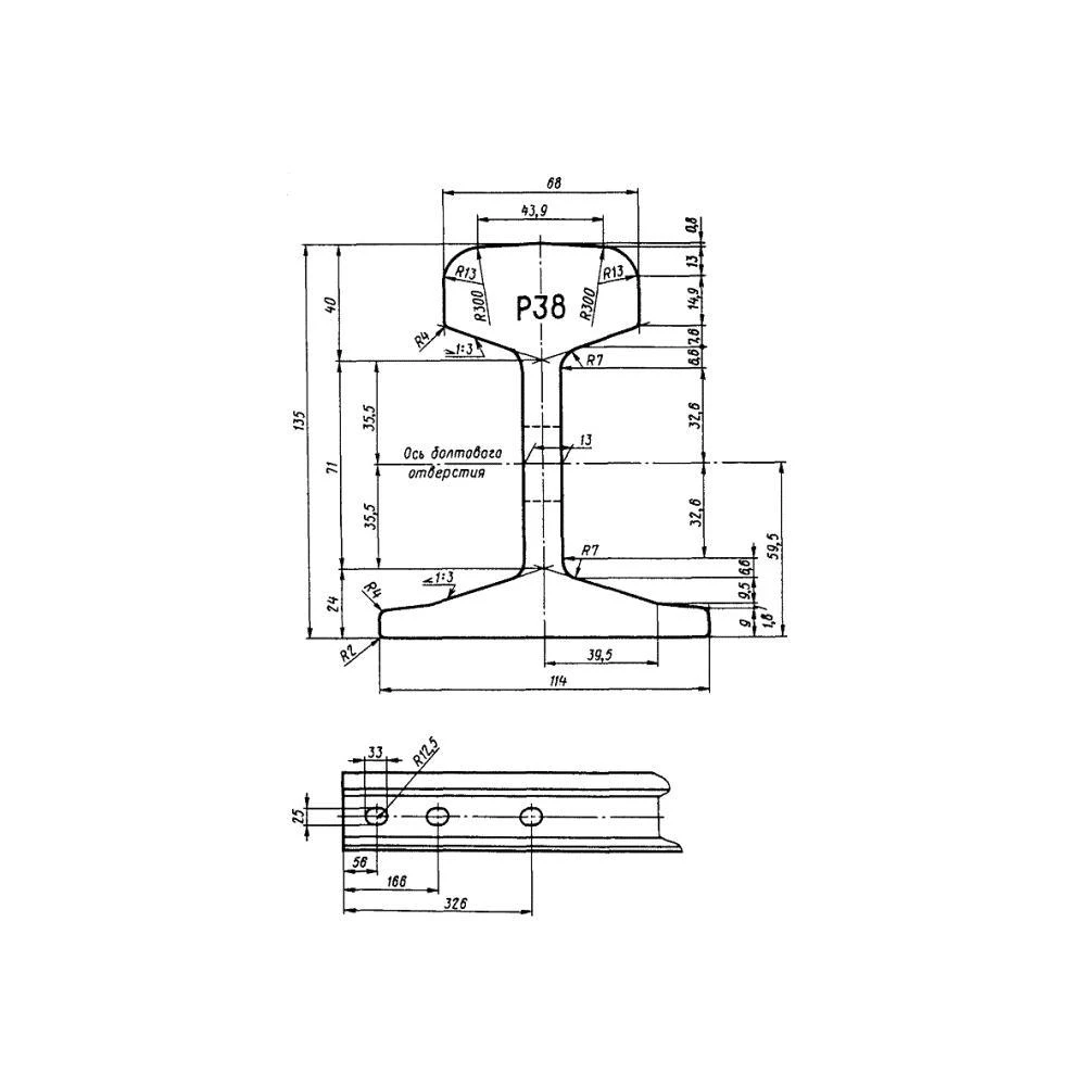 Мы продаем железнодорожный рельс Р38, отгружая со своего склада в Твери продукцию, отвечающую всем действующим нормативам. Согласно ГОСТ 30165-94 и ДСТУ 2539-94, габаритные размеры данного металлопроката составляют 135 мм. в высоту и 114 мм. в ширину (ширина основания). Толщина головки при этом составляет 68 мм., толщина шейки – 13 мм. Рельсы Р38 отгружаются заказчикам в зависимости от приобретаемого тоннажа: при мерной длине в 12,5 метров масса одной рельсы составляет около 481 кг. При необходимости мы готовы поставить заказчику прокат немерной длины – отрезками от 4 до 12 метров.